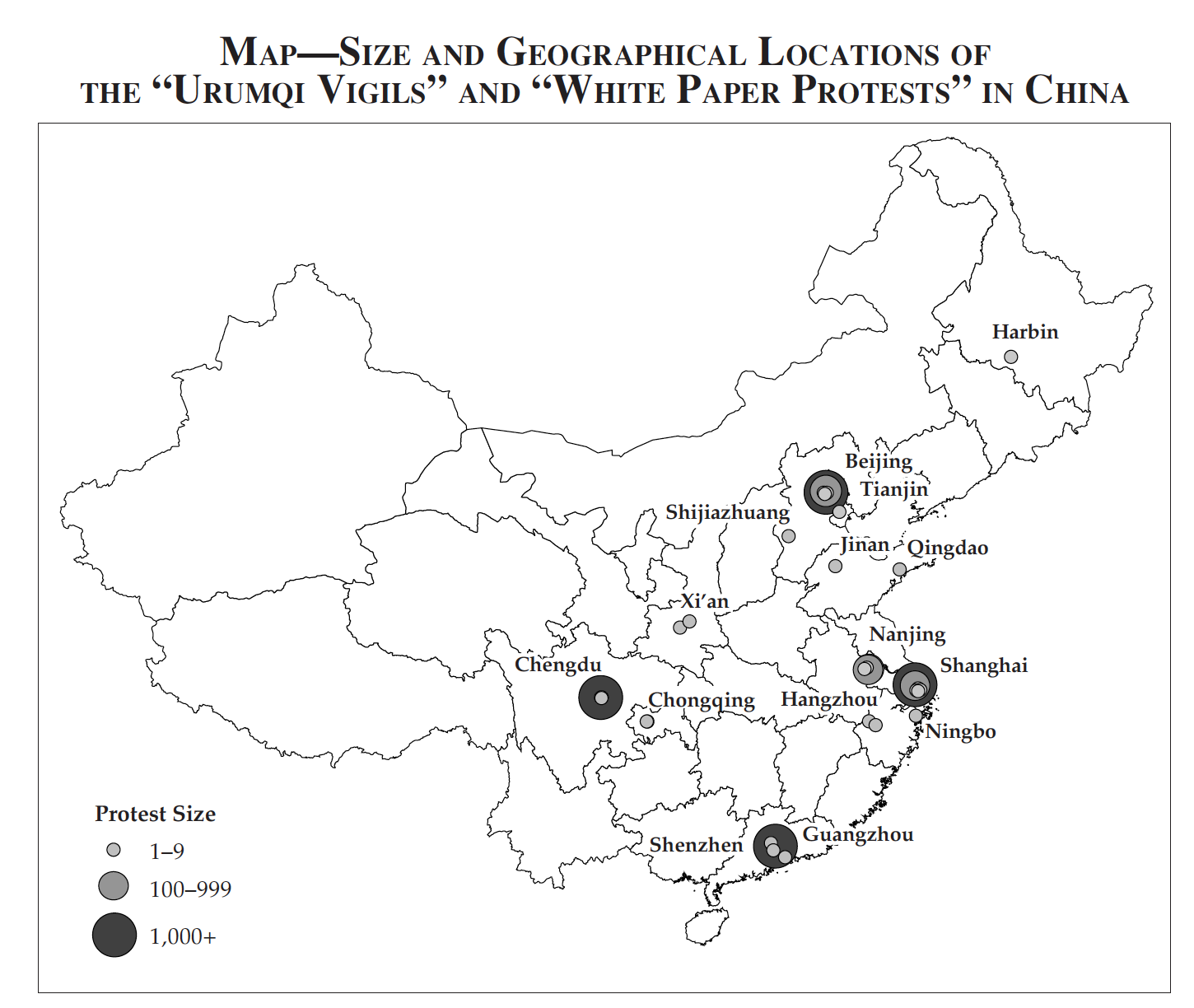Most protests were small-scale, attracting a few hundred participants. Those consisting of more than 1,000 participants occurred only in Beijing, Shanghai, Guangzhou and Chengdu.